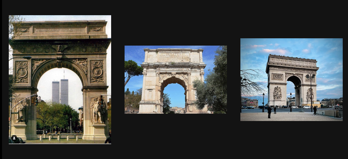 (From left to right: The Washington Square Park Arch, The Arch of Titus, L'Arc De Triomphe)